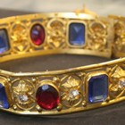 A gilt metal, pale blue, green and colourless paste collar, a blue, red and colourless paste coronet, and a multi-section item of similar regalia.
