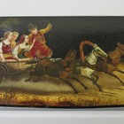 A 19th Century Russian papier-mâché rectangular stamp box, the lid painted with a man and three women aboard a three-horse-drawn troika racing through a summer landscape, hinged to reveal four stamp compartments, the red interior with silver medallions maker's mark to lid, length approx 11.5cm.