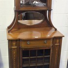 An Edwardian mahogany display cabinet, with inlaid urns, swags and bellflowers, fitted with a glazed door above downswept supports and a mirror back, the base fitted with a drawer and a lattice glazed cabinet, on square tapering legs, height approx 174cm, width approx 76cm.