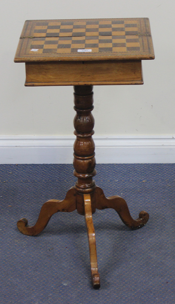 A 19th Century Continental fruitwood chess table, the hinged top revealing a compartment above a turned stem and tripod legs, height approx 39cm, together with a turned bone chess set, height of king approx 8cm.