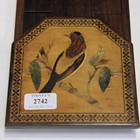 A Victorian rosewood Tunbridge ware sliding book rack, the hinged end inlaid in various woods with a bird perched on a branch, the other end with a typical geometric cube pattern, width approx 33cm (minor faults).