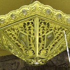 A pair of early 20th Century gilt brass hexagonal ceiling lights, the pierced foliate panels inset with cut glass lozenges, width approx 39cm (lacking one glass insert).