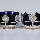 A set of four Arts and Crafts silver salts with blue circular glass liners, each framed with stylized tree supports and loop handle, London 1902, 1903 and 1906 by Omar Ramsden & Alwyn Carr, each height approx 3.4cm.