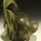 A 19th Century copy of a 16th Century burgonet, the two piece skull with hinged cheek pieces, the rivets with pewter rosettes, plume holder at rear of comb with ostrich feather plume (some damage).
