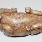 A Chinese jade figure of a recumbent buffalo, probably late Qing dynasty, modelled with its head turned back over its left shoulder, the stone of greyish celadon and russet tone, length approx 11cm.
