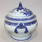 A Chinese blue and white export porcelain oval soup tureen and cover, Qianlong period, each painted with a censer, vase and flowers within a floral border, length approx 37cm.