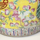 A pair of Chinese famille rose decorated yellow ground porcelain jardinières, late 19th Century, of tapered cylindrical form, each painted with opposing panels filled with pine tree, fruiting peach branch, lingzhi fungus and rocks emanating from waves beneath a flying bat and ruyi sceptre suspended from an overhanging branch, reserved against a yellow ground filled with bats and peaches surrounding shou medallions, height approx 36cm (one restored, glaze flaking and the other with chip and star crack to drainage hole).
