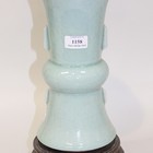 A Chinese celadon glazed beaker vase, 20th Century, of flared form and covered in a crackled glaze, impressed seal mark to base, height approx 31cm (repaired rim), with wood stand.