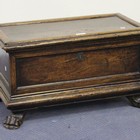 A 19th Century Italian walnut miniature cassone, the panelled lid above panelled sides, on carved claw feet, height approx 35cm, width approx 64cm.