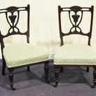 A pair of Edwardian mahogany nursing chairs with carved and pierced splat backs above upholstered seats, on turned legs, height approx 78cm, width approx 46cm.