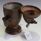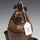 A 19th Century Egyptianesque brown and gilt patinated cast bronze tobacco box in the form of a canopic jar and cover, the hinged lid modelled as the head of Qebehsenuef, the falcon head above an ovoid body, cast in relief with hieroglyphs and a winged beetle, the flared base raised on a rouge marble plinth, height approx 28cm.