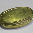 An 18th Century Dutch brass tobacco box of oval form, the hinged lid and base with engraved figures and script, length approx 14cm (faults).