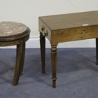 A 19th Century mahogany commode cabinet, with turned wood handles and four false drawers, opening to reveal a fitted interior, on splayed bracket feet, height approx 68cm, width approx 62cm, together with a 19th Century mahogany bidet stool with brass carrying handles and turned supports (alterations), and a French style marble top coffee table with gilt metal mounts and shaped square supports (faults).
