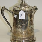 A late 19th Century American plated jug by Reed & Barton, the cylindrical body with ceramic liner, the exterior engraved with flowers, the hinge lid with turned finial, height approx 27cm.