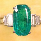An emerald and diamond ring, claw set with the oval cut emerald between baguette diamond set stepped two stone shoulders.