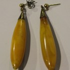A pair of mottled honey coloured amber drop shaped earrings, length of each amber drop approx 4cm (both chipped).