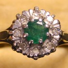 An 18ct gold, emerald and diamond cluster ring, claw set with the circular cut emerald within a surround of eight circular cut diamonds.