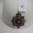 A post-1952 Royal Marines tropical helmet, dated 1975, with earlier helmet plate, retaining ball top (faults) and chin chain.