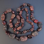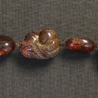 A Chinese single row necklace of twenty-five graduated semi-translucent dark butterscotch coloured amber beads carved with fruit and leaves, alternating with twenty-five graduated flattened oval semi-translucent dark butterscotch coloured amber beads, gross weight approx 76.3g, length approx 97cm, length of largest carved bead approx 2.6cm, length of smallest carved bead approx 1cm, length of largest flattened oval bead approx 1.7cm, length of smallest flattened oval bead approx 7mm.