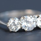 A white gold and platinum diamond three stone ring, claw set with a row of cushion shaped diamonds, with the principal diamond mounted at the centre, detailed '18ct Plat'.