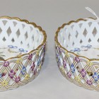 A pair of Meissen porcelain circular bowls, late 19th/early 20th Century, each base interior painted with two birds on a branch within a surround of floral garlands hung from blue ribbons, the pierced trellis sides encrusted to the exterior with flowerheads and heightened with gilt detail, crossed swords in underglaze blue to bases with asterisk and dashes, diameter approx 15cm.
