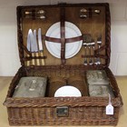 An Edwardian wicker cased picnic set by Drew & Sons, Piccadilly Circus, the interior fitted with three nickel plated copper containers, wicker covered bottles, cutlery and ceramic plates, width approx 55cm (some faults and matched items).