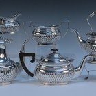 A George V silver five-piece tea set of oval half reeded form, comprising teapot, hot water jug, sugar bowl and a coffee pot, Birmingham 1920 and spirit kettle, on heater base, Birmingham 1926, all by S. Blanckensee & Sons Ltd.