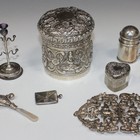 An Edwardian silver and amethyst glass thistle form ring tree, Birmingham 1910 by Adie & Lovekin Ltd, height approx 7cm, together with a Burmese white metal embossed jar and cover, an owl child's rattle, Birmingham 1926, and a small collection of other silver items.