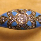 A gold, turquoise coloured enamelled and diamond set ring, mounted with the principal cushion shaped diamond within a quatrefoil surround mounted with rose cut diamonds, between diamond set three stone foliate shoulders.