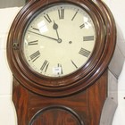 An early 19th Century figured mahogany wall timepiece with brass four pillar weight-driven movement, the painted dial with Roman numerals, the circular moulded hood with glazed door, the trunk with arched door above ogee stepped apron, height approx 145cm, with pendulum, weight and winding key (some faults).