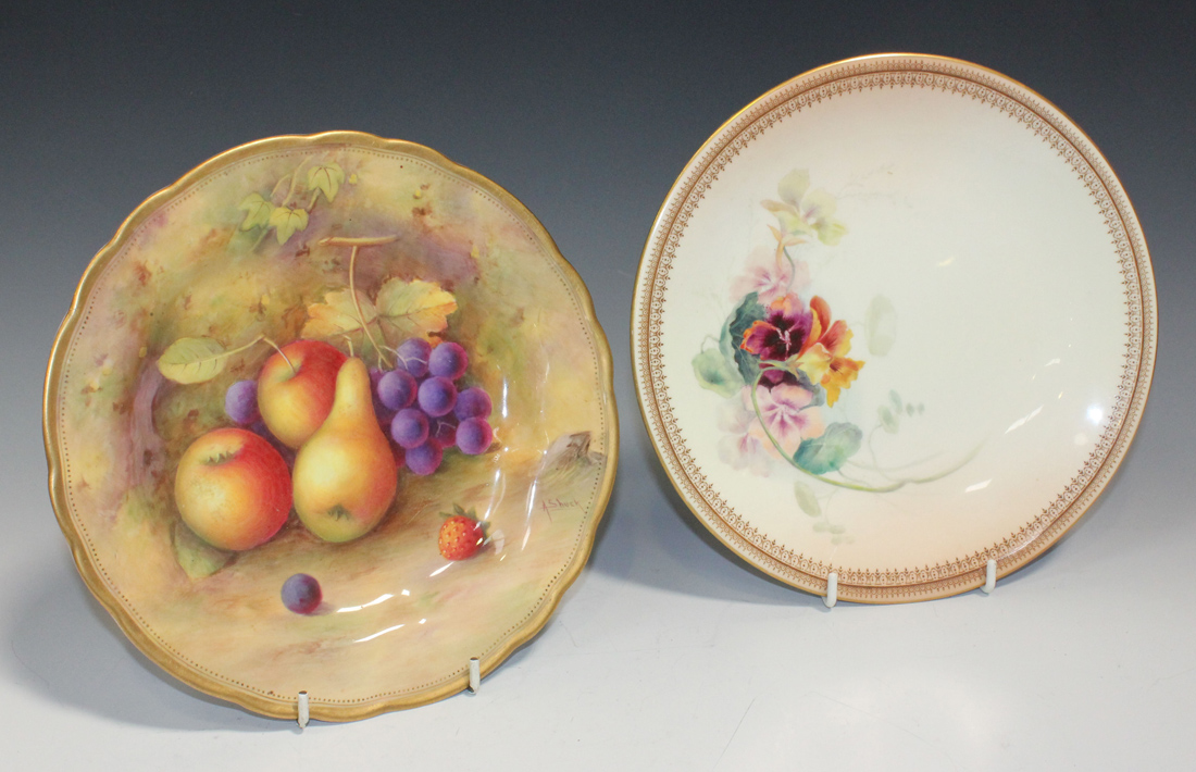 A Royal Worcester porcelain cabinet plate, circa 1929, painted by A. Shuck, signed, with a still life study of fruit within a gilt edged rim, puce printed, impressed and painted factory marks to reverse, diameter approx 22.8cm (small chip to underside rim edge), together with another Royal Worcester porcelain blush ivory plate painted with nasturtiums.