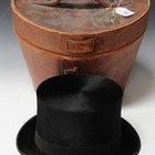 A late 19th/early 20th Century black top hat, marked 'London Manufacture', aperture approx 19.5cm x 15.5cm, within a brown leather case.