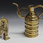 An Indian polished cast bronze sectional figure of Shiva seated on horseback, carrying Parvati with his left arm and holding a sword in his right hand, beneath a detachable prabha, on a rectangular stand, height approx 17.5cm, together with an Eastern brass ewer (lacking cover).