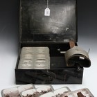 An early 20th Century aluminium hand-held stereoscopic viewer, together with a full set of grey stereoscopic Realistic Travels cards depicting First World War scenes, 1-100, within a black tin.