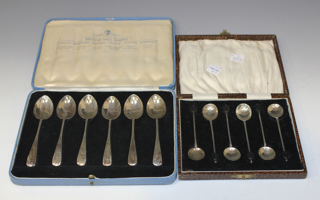 A set of six 'British Hallmarks' silver Old English pattern teaspoons, London, Birmingham, Sheffield, Chester, Glasgow and Edinburgh 1935 by Roberts & Belk, cased, together with a set of six silver bean end coffee spoons, Birmingham 1926, cased.