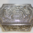A Chinese white metal box with hinge lid, embossed with dragons, bats, flowers and shou medallions, length approx 10cm.