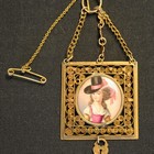 A gold and enamelled pendant of square form, the centre mounted with the enamelled portrait of a lady wearing a hat within a wirework pierced square border, with a heart shaped drop, and a three chain suspension surmount, length approx 8cm.