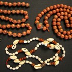 A single row necklace of seeds interspersed with cowrie shells, and two reddish brown stained bead necklaces simulating coral, including one with a carved coral cameo clasp.