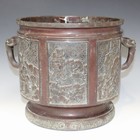 A Japanese brown patinated bronze two handled jardinière, Meiji period, the cylindrical body cast in relief with rectangular panels filled with boys, beneath a key fret rim, cast pseudo seal mark to base, height approx 24cm.