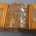 An early 20th Century Chinese camphor trunk, the shaped lid and front carved with figures, on stepped feet, height approx 56cm, width approx 94cm.