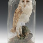 A late 19th Century taxidermized barn owl, mounted in a naturalistic setting within a glass dome, height approx 39cm, diameter approx 20.8cm, on a plinth base.