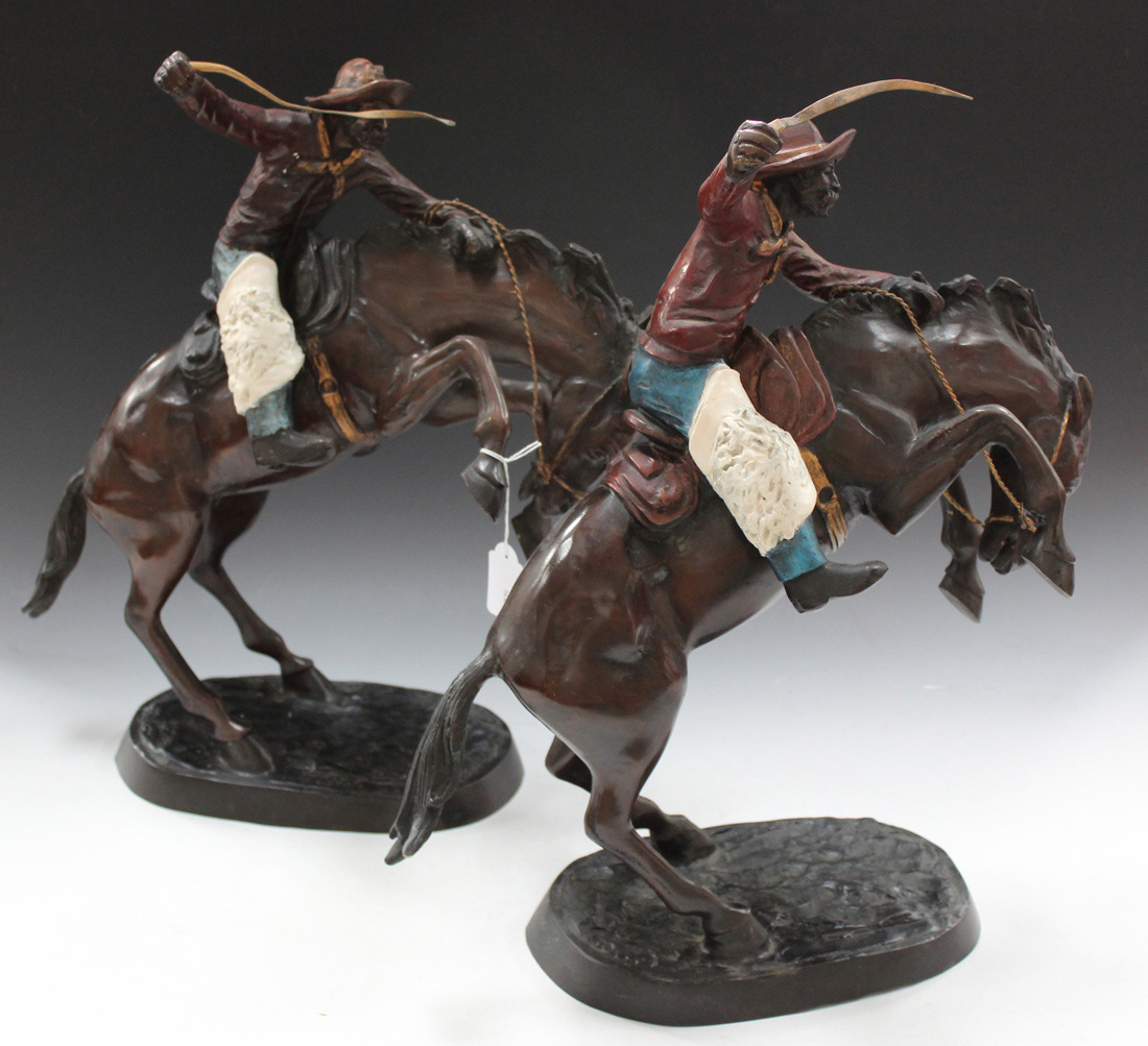 Two modern Remington style bronze effect figures of cowboys on horseback, height approx 49cm.