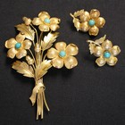 A gold and turquoise set brooch, designed as a floral spray, and a matching pair of gold and turquoise set earclips, each designed as a single flower stem, width of brooch approx 8.5cm, each earclip approx 2.7cm.