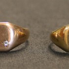 Two 9ct gold signet rings, another gold signet ring, mounted with a small cushion shaped diamond, and a 9ct two colour gold and colourless gem set eternity ring.