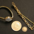 A 9ct gold triple bar link bracelet with facet cut decoration, on a heart shaped padlock clasp, a 9ct gold lady's wristwatch and two silver coins.