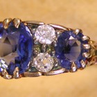 A gold, sapphire and diamond ring, claw set with three oval cut sapphires and two pairs of cushion shaped diamonds, detailed '18' (one of the smaller sapphires is cracked through down the centre).