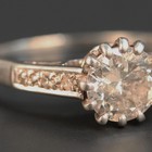 A platinum and diamond ring, claw set with the principal circular cut diamond between diamond set three stone shoulders.