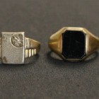 A 9ct gold and black onyx set signet ring, two silver rings, and five further rings.
