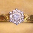 An 18ct gold and diamond set single stone ring, mounted with a circular cut diamond between decorated shoulders, Birmingham 1963.