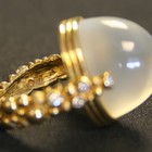 A gold, moonstone and diamond set ring by Gilbert Albert in an abstract design, mounted with a single large oval cabochon moonstone within a reeded setting, the shank with a beaded finish and collet set with diamond four stone shoulders, detailed '750 7033', with the original case.